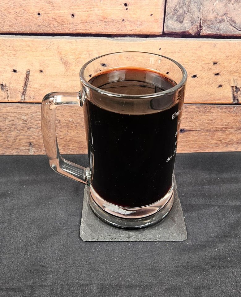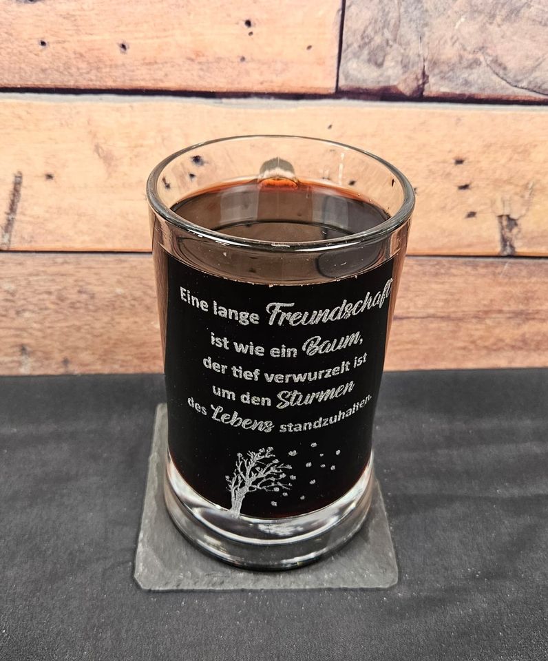 Der Bierkrug wird mit dem Spruch "Eine lange Freundschaft ist wie ein Baum, der tief verwurzelt ist um den Stürmen des Lebens standzuhalten" graviert.