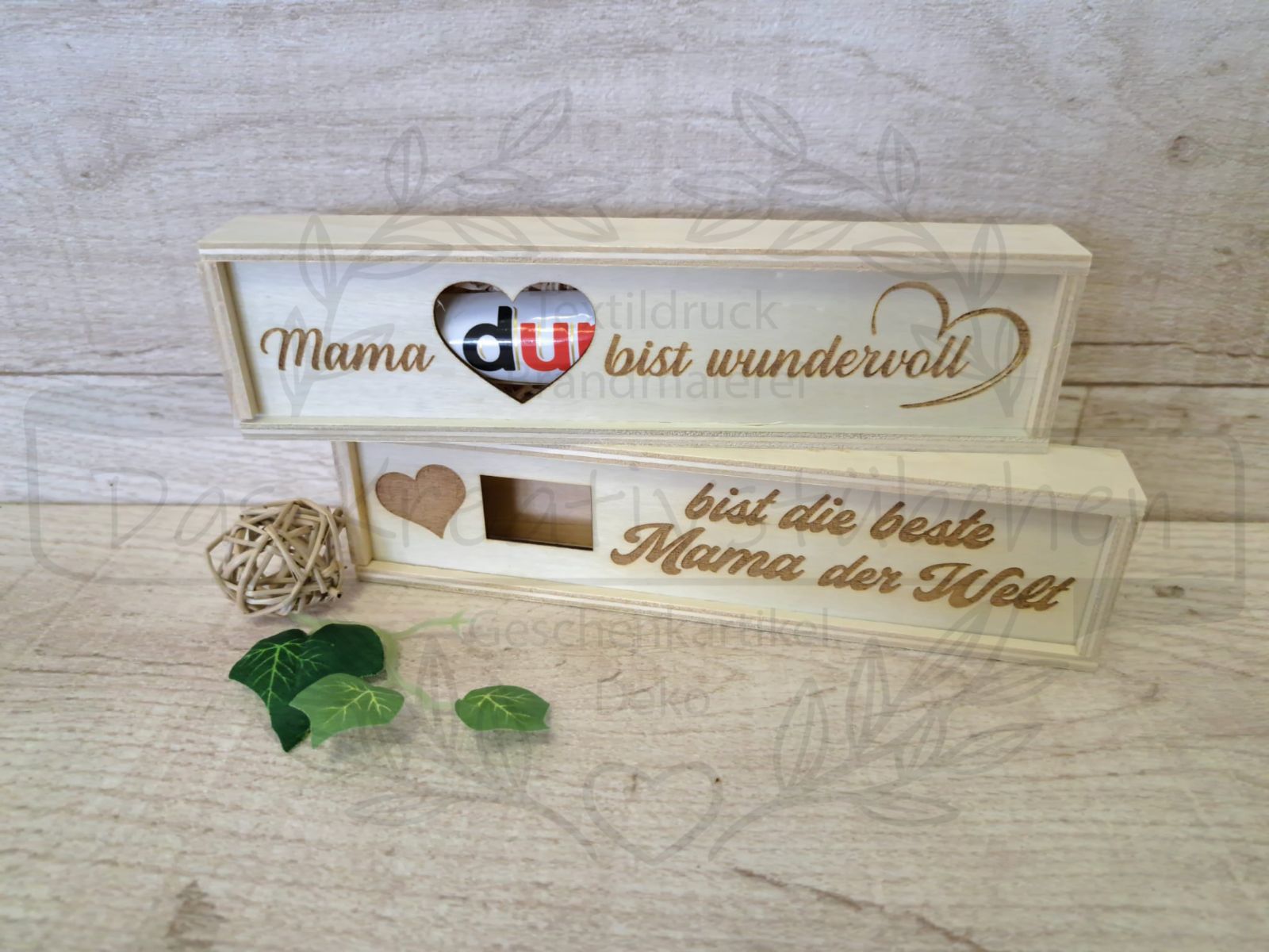 Wir bieten euch Duplo Geschenkboxen mit der Gravur "Mama/Papa DU bist wundervoll oder DU bist die/der beste Mama/Papa der Welt"! Diese Geschenkbox ist das perfekte Geschenk zum Mutter oder Vatertag.