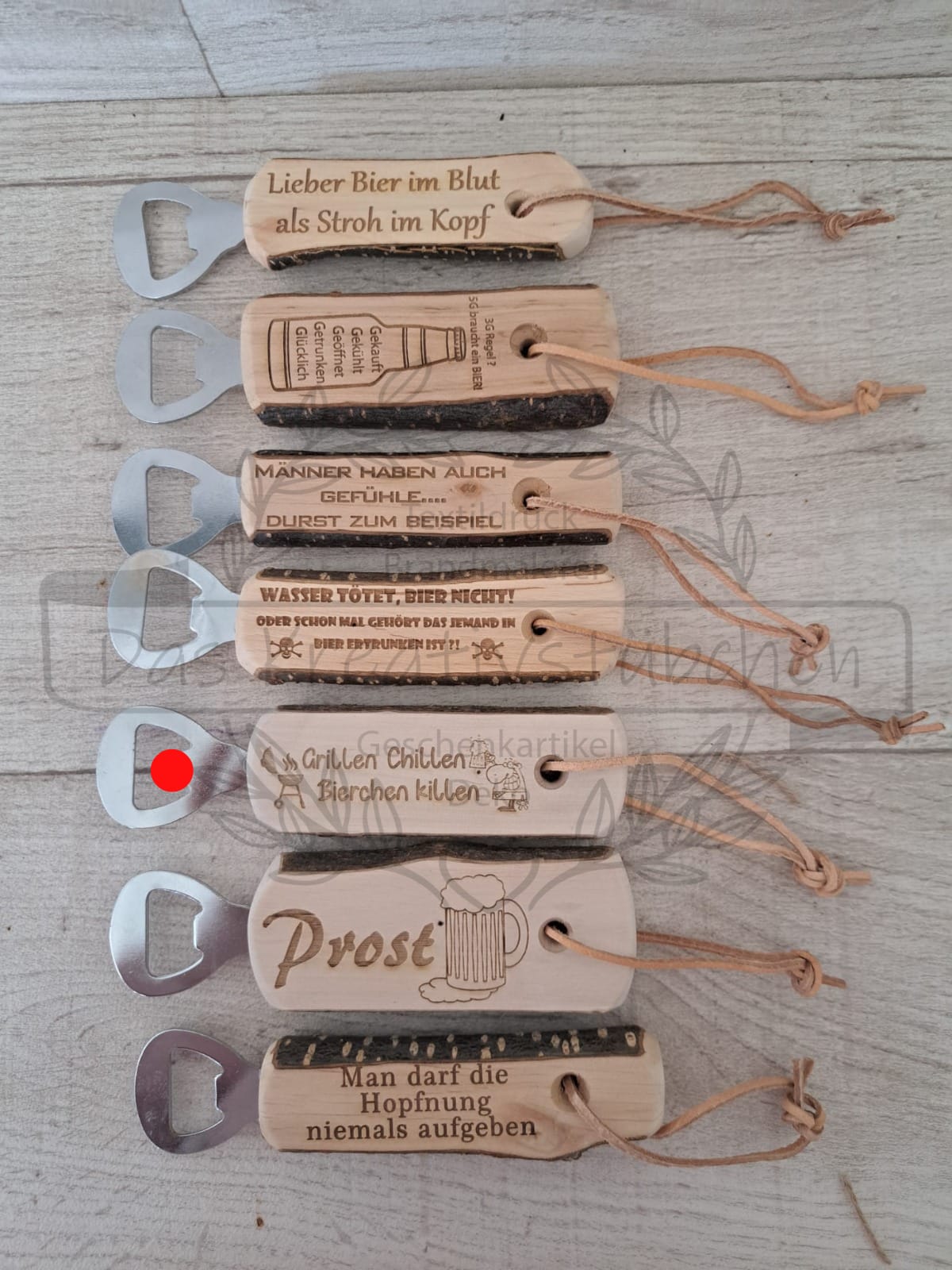 Da es sich um ein handgefertigtes Naturprodukt handelt, ist jedes Produkt ein Unikat. Hergestellt mit Liebe und viel Herz. Dementsprechend kann es zu leichten Abweichungen im Farbschema, der Gravurhelligkeit - sowie Tiefe der Textur oder der Verarbeitung kommen. Diese holzbedingten Abweichungen werden nicht als Reklamationsgrund angesehen.
