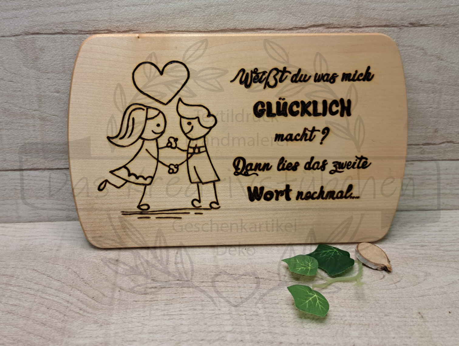 Da es sich um ein handgefertigtes Naturprodukt handelt, ist jedes Produkt ein Unikat. Hergestellt mit Liebe und viel Herz. Dementsprechend kann es zu leichten Abweichungen im Farbschema, der Gravurhelligkeit - sowie Tiefe der Textur oder der Verarbeitung kommen. Diese holzbedingten Abweichungen werden nicht als Reklamationsgrund angesehen.