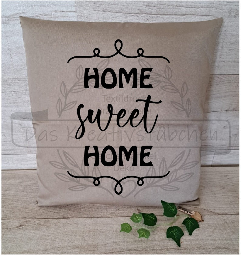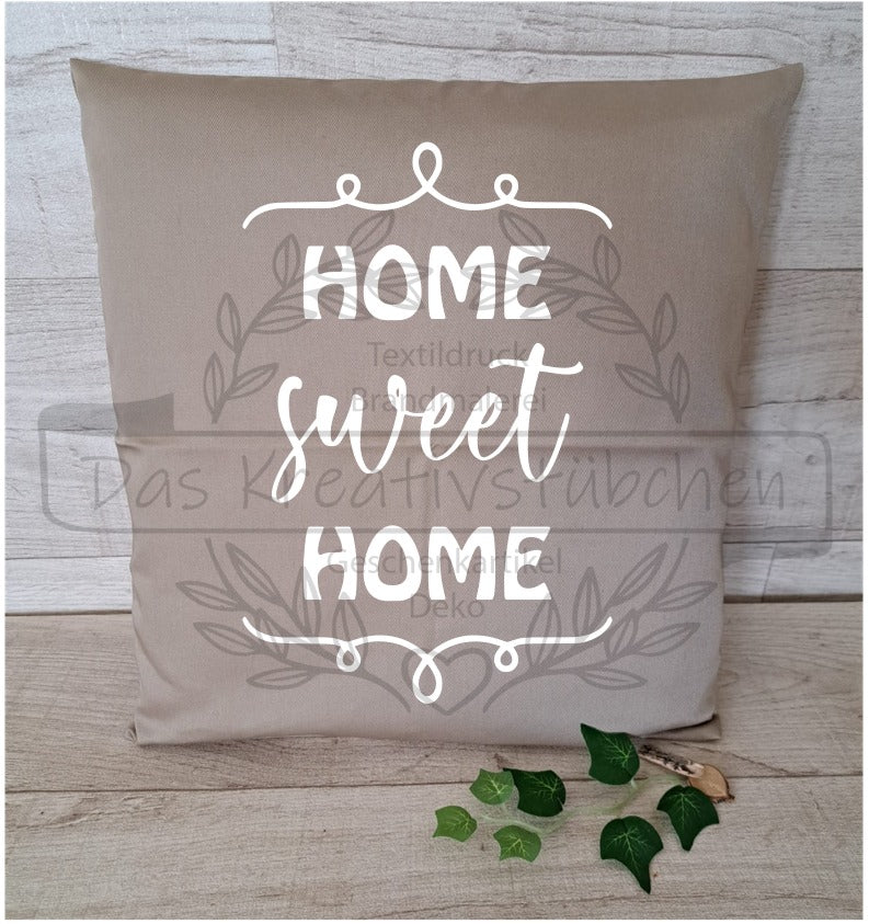 Wir bedrucken Textilien ganz Individuell, wie unser Kissen "Home Sweet Home".