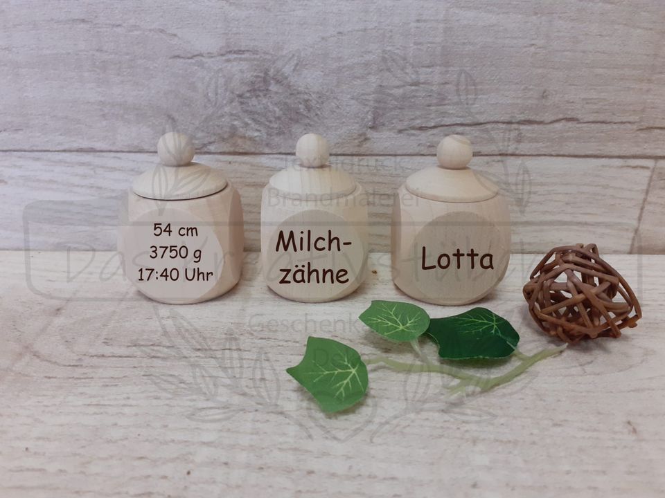 Dann sind sie bei uns im Kreativstübchen genau richtig. Wir fertigen für sie Milchzahndosen mit Namen, Geburtsdatum, Größe und Gewicht.