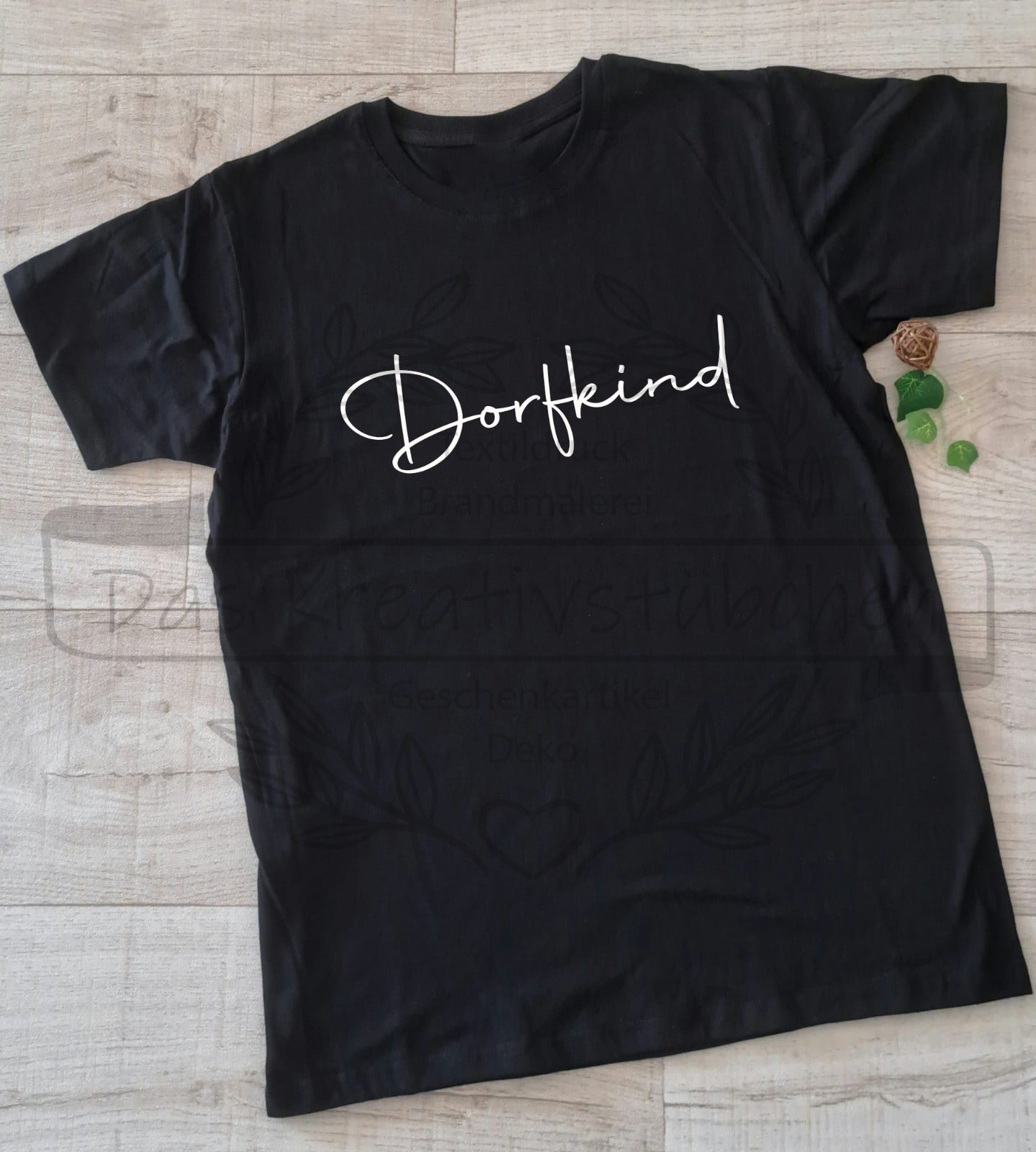 Wir bedrucken Textilien ganz Individuell, wie unser T-Shirt "Dorfkind".