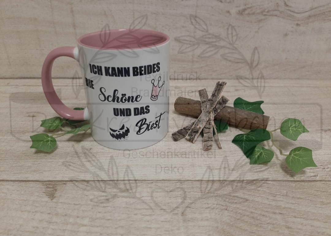 Wir bieten diese Tasse mit dem Spruch "Ich kann beides, die Schöne und das Biest" an.