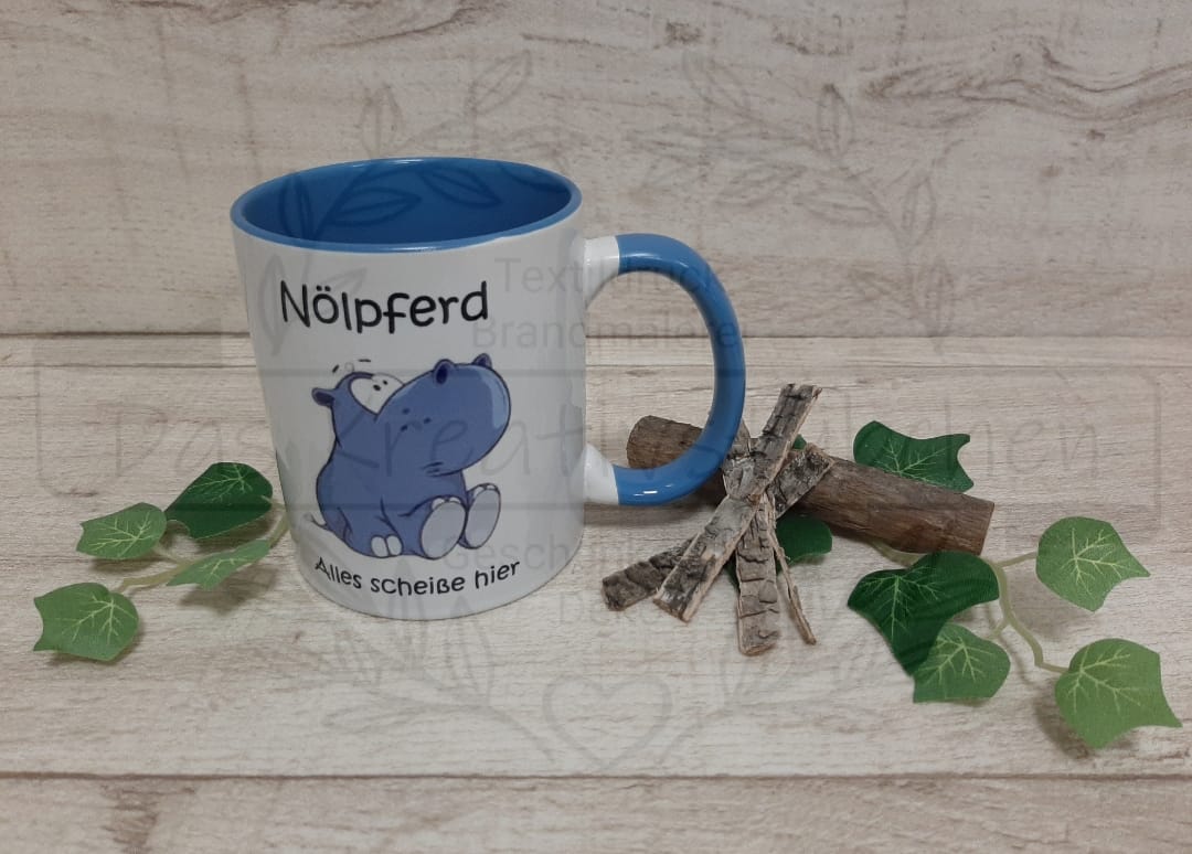 Wir bieten Tassen mit lustigen Sprüchen wie z. B. unsere "Nölpferd" Tasse.