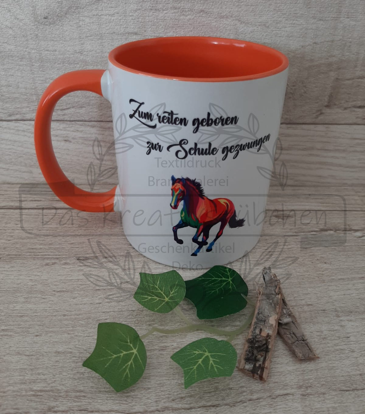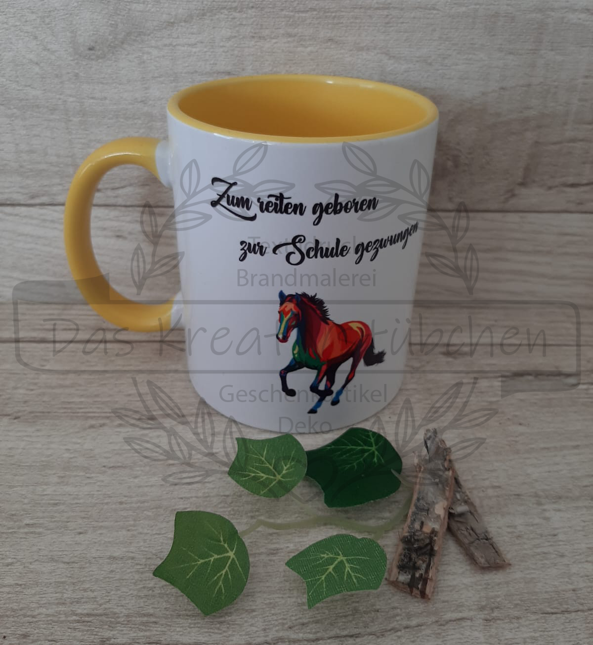 Wir bieten diese Tasse mit dem Spruch "Zum reiten geboren" an.