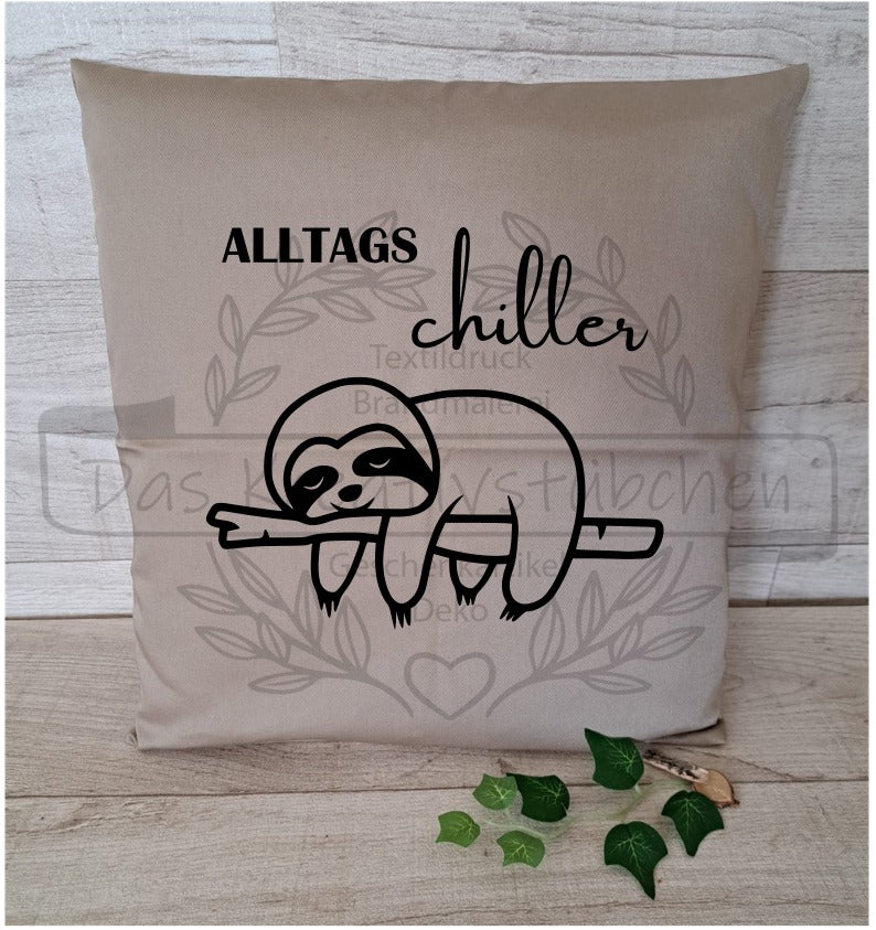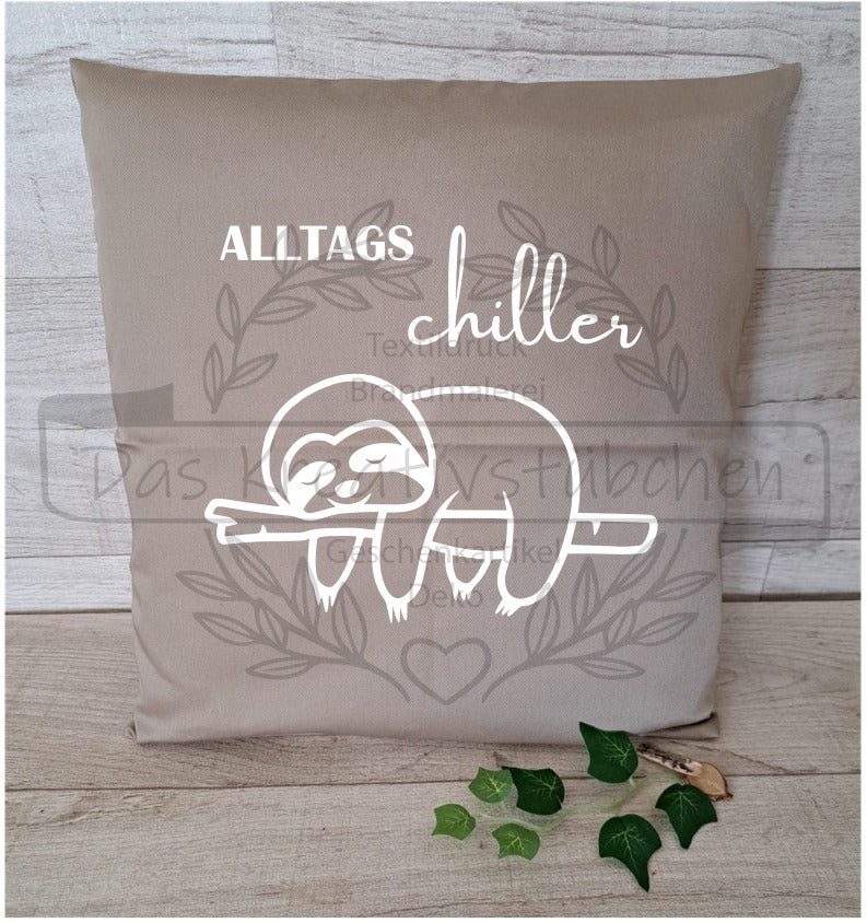 Wir bedrucken Textilien ganz Individuell, wie unser Kissen "Alltagschiller".